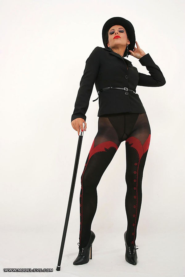 MILF Eve wearing cylinder hat, victorian gentleman's jacket and silver top cane and fashionable pantyhose spreads her legs to show her goodies