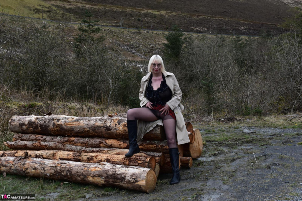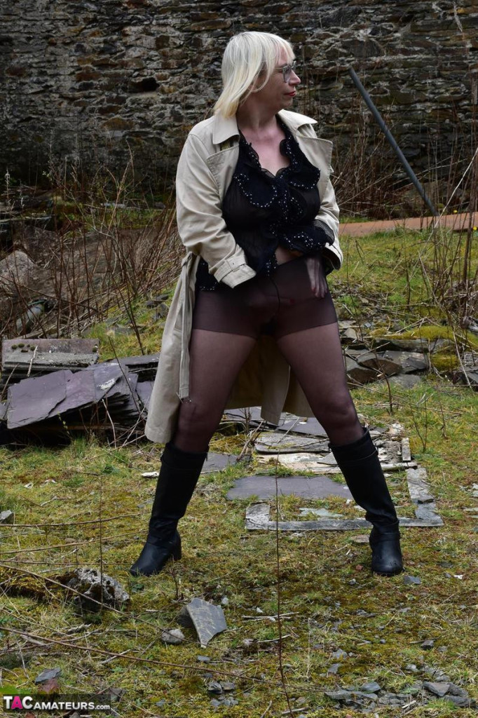 Busty mature Barby Slut in black pantyhose shows off her goodies in the open air